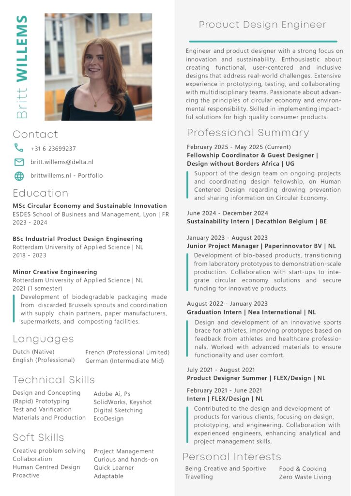 I’m Britt, a product design engineer with a big heart for the planet, a creative mind for problem-solving, and an energy that people often call contagious. My journey started in the Netherlands, where I studied Industrial Product Design and Engineering. Growing up in a family of engineers, I learned early on to build, explore, and question how things work, but I’ve always paired that technical curiosity with creativity and a strong sense of purpose.